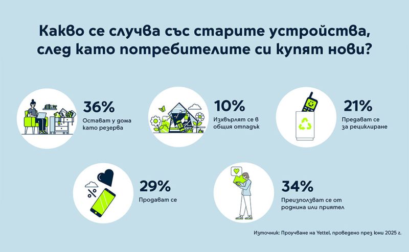 „Вече 4 години провеждаме проучване за поведението и нагласите на потребителите относно използването на мобилни устройства и събраните данни ни дават ценна информация за въпросите, които като телеком трябва да адресираме. Един от тях е именно склонността им да пазят ненужната си техника, като мотивите им са различни – искат да имат резервно устройство, планират по-нататъшна продажба, не мислят, че има стойност в тях, или не знаят какво точно да направят“, разказа Маргита Колчева, мениджър „Устойчиво развитие“ в Yettel по време на конференцията „Re:Think Green - Зелени решения от България, подкрепени от данни”, организирана от MOVE.BG. Форумът е посветен на зелените иновации, които подсилват конкурентоспособността на икономиката и подкрепят устойчивото развитие.