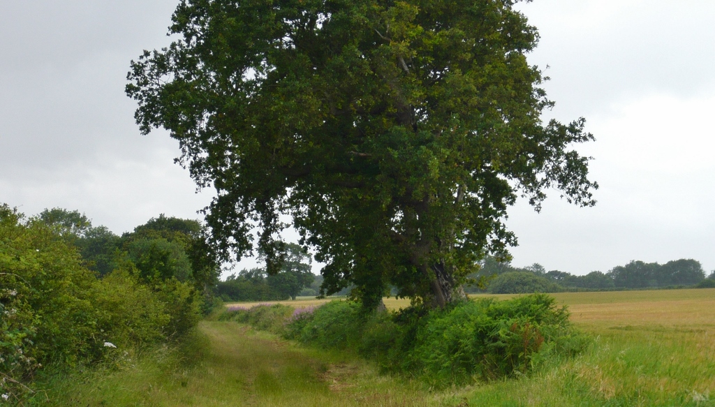 Започва да ръми, а в далечината се дочува и гръмотевица, така че търсим къде да се скрием. Вече сме по някаква зелена алея покрай полето, но за късмет има едно голямо дърво, където изчакваме да ни подмине облакът.