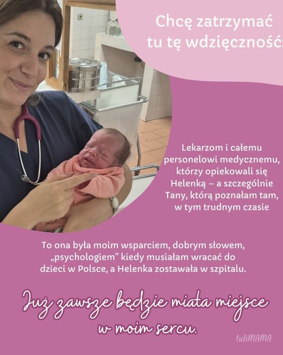 Майката изразява благодарността си и в социалните мрежи, където споделя, че нейна голяма опора е била д-р Таня Делчева, един от младите специалисти в Отделението по неонатология: „Беше моят утешител, моят „психолог“, когато трябваше да се върна при децата си в Полша, а Хеленка остана в болницата. Тя винаги ще има място в сърцето ми".