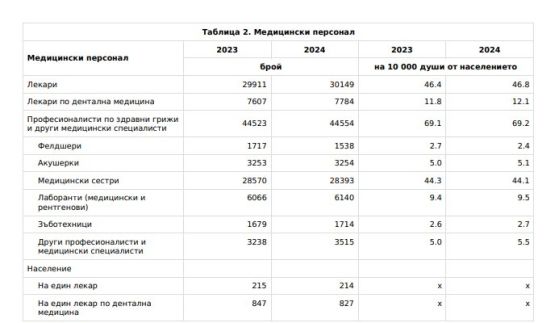 В края на 2024 г. на основен договор в лечебните и здравните заведения в страната практикуват 30 149 лекари. Лекарите по дентална медицина са 7 784, като 6 740 от тях работят в практики със сключен договор с НЗОК. Професионалистите по здравни грижи и другите медицински специалисти са 44 554, от които 28 393 медицински сестри и 3 254 акушерки.