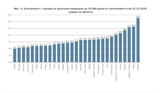 Осигуреността с лекари в края на 2024 г. общо за страната е 46.8 на 10 000 души от населението, а с лекари по дентална медицина - 12.1. Осигуреността на населението с лекари по области варира от 25.1 до 80.3 на 10 000 души, като най-висока е в областите, в чиито центрове има медицински университети и университетски болници - Плевен (80.3 на 10 000 души от населението), София (столица) (57.7), Пловдив (57.4) и Варна (52.0). Най-нисък е показателят за областите Кърджали (25.1 на 10 000 души от населението), Ямбол (29.3) и Хасково (29.8).